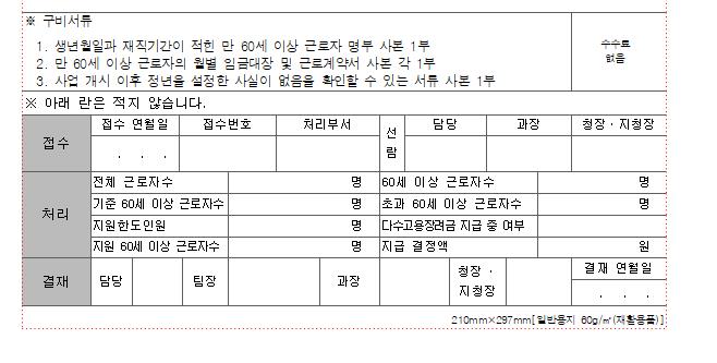 - 만 60세 이상 근로자의 월별 임금대장 및 근로계약서 사본
