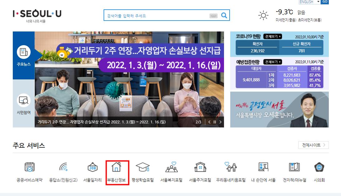 서울시 홈페이지에서 [주요서비스]-[부동산정보]로 이동합니다.