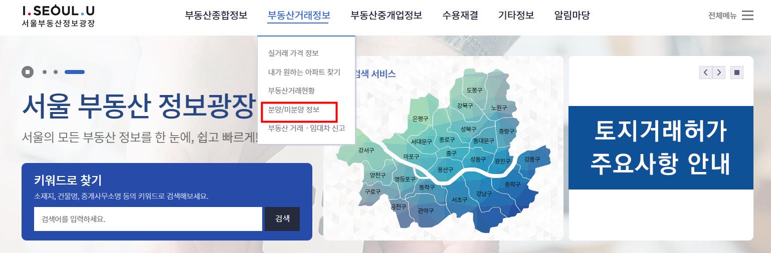 서울부동산정보광장에서는 서울시와 관련된 부동산 종합정보와 거래정보,분양/미분양정보, 부동산 거래와 임대차신고등 각종 부동산 업무를 확인할수 있습니다.