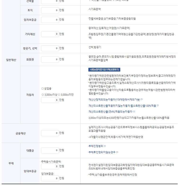 기초연금 소득인정액 모의 계산에서 가구유형과 거주지,근로소득,사업소득,재산소득,공적이전소득,무료임차소득,일반재산,건축물,토지,임차보증금,기타재산,자동차,금융재산,예금,대출금,임대보증금,등 소득과 재산정보를 작성합니다.