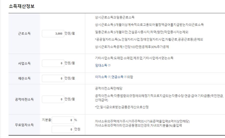 - 소득환산율 : 주거용 재산(월 1.04%),일반재산(월 4.17%),금융재산(월 6.26%),자동차(월 100%)