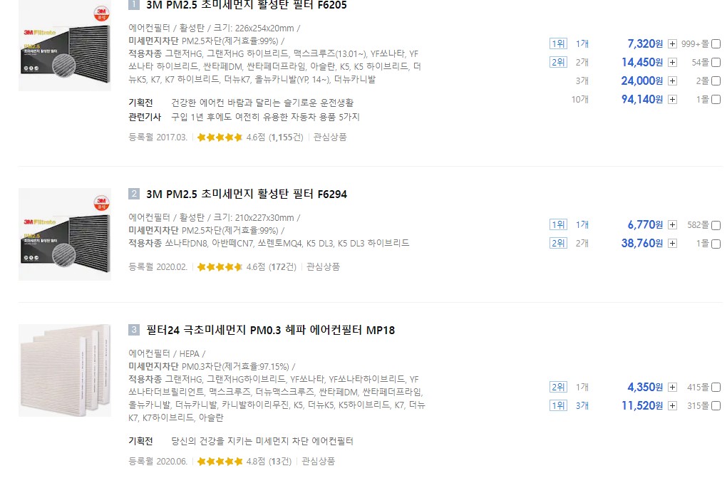 나의 차량에 맞는 에어컨 필터 가격들이 검색결과로 나오면 원하는 상품을 클릭후 구매 합니다.