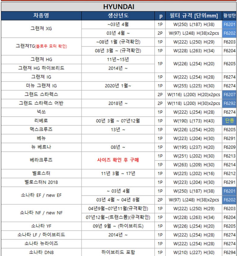 차량 종류별로 에어컨 필터 규격이 달라서 qm6,sm6,스파크,그랜저,티볼리,모닝,아반떼,k5,그랜저,쏘렌터,싼타페,말리부,소나타등 차종에 맞춰서 구매하시는게 좋습니다.