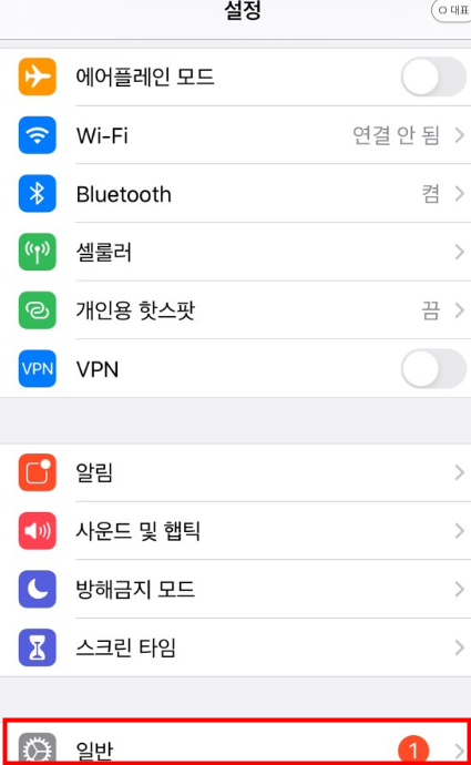 설정의 첫 화면에서 하단에 있는 빨간색 박스에 일반을 선택하고 들어 갑니다.