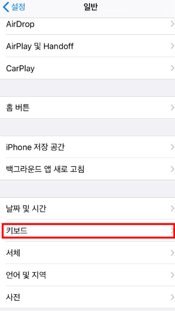 설정의 일반 메뉴에 들어가면 하단 날짜 및 시간 아래에 키보드 설정을 선택해서 들어 갑니다.