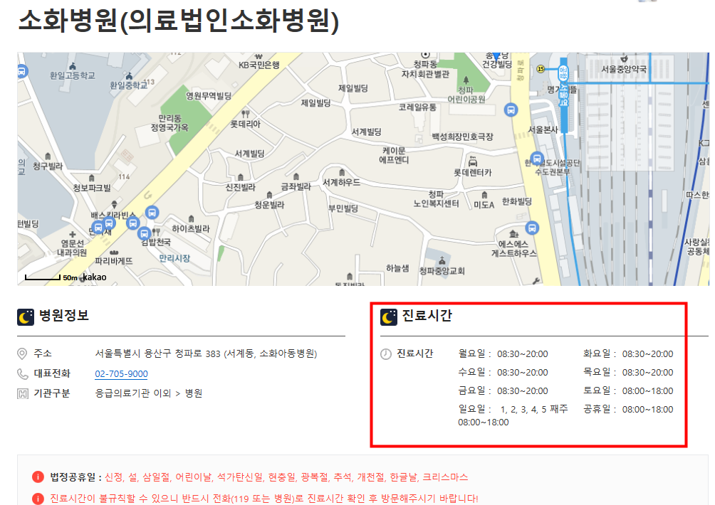 원하는 지역의 병원의 상세보기를 선택하면 병원의 위치와 정보, 진료시간을 확인 할 수 있습니다.