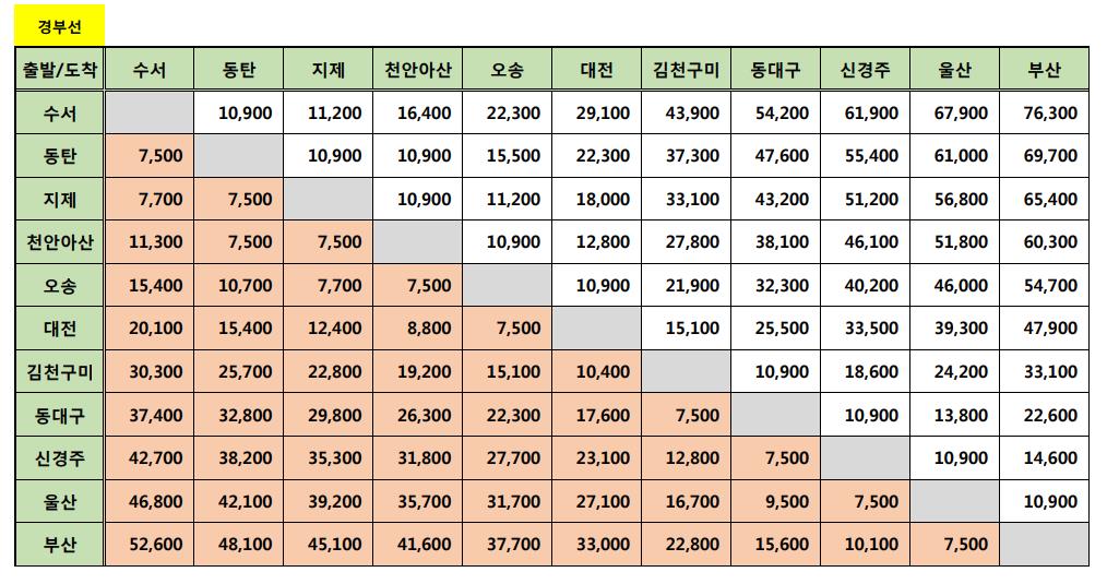 주황색은 일반석, 하얀색은 특실 요금입니다.