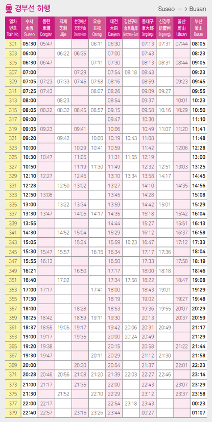 출발역인 수서역에서 동찬역,지제역,천안아산역,오송역,대전역,김천구미역,동대구역을지나 신경주역,울산역,부산역까지 가는 하행선입니다.