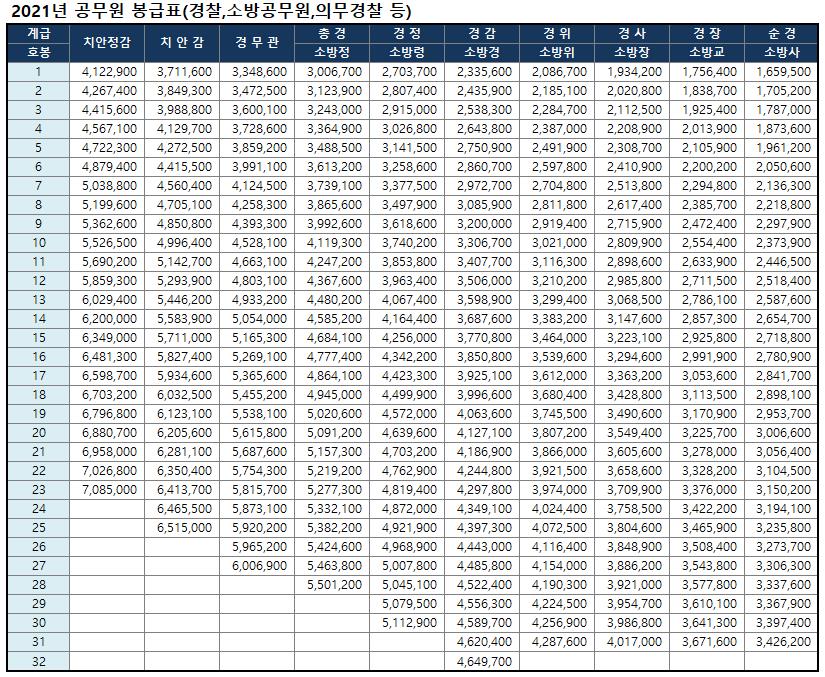 소방공무원과 의무경찰,경찰공무원의 2021년 공무원 봉급표입니다.