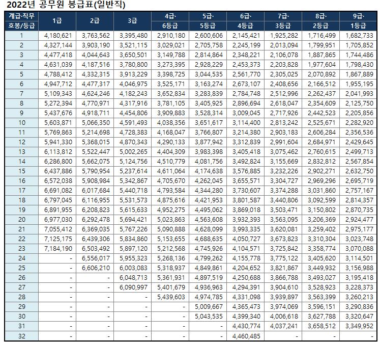 2022년 일반직 공무원 1.4%인상 반영한 봉급표 입니다.
