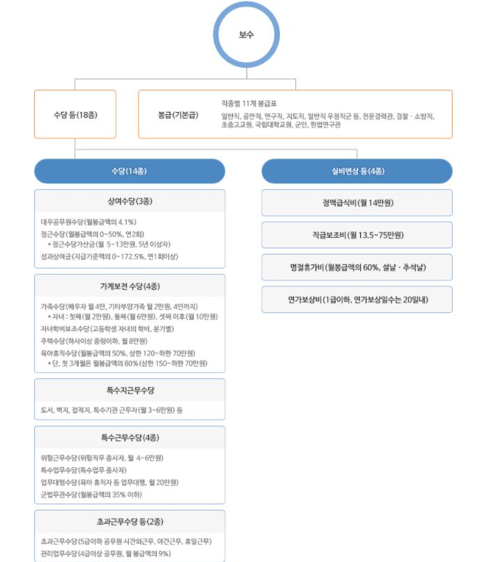 기본급인 봉급에서 수당인 상여수당,가계보전수당(가족수당,자녀학비보조수당,육아휴직수당),특수지근무수당,특수근무수당,초과근무수당과 실비변상등인 정액급식비,직급보조비,명절휴가비,연가보상비가 합쳐서 실 급여가 지급됩니다.