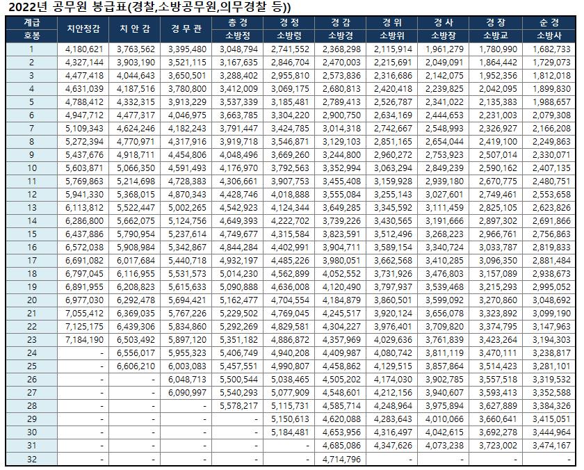 2022년 소방공무원과 경찰공무원 봉급표입니다. 1.4%인상 반영되었으며 그외 수당등은 별도로 지급됩니다.