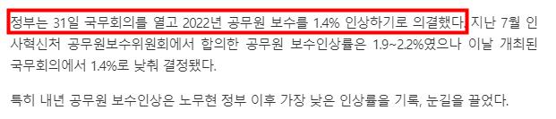 지난 9월 국무회의에서 2022년 공무원보수 인상률이 1.4%로 인상되도록 의결되었습니다.